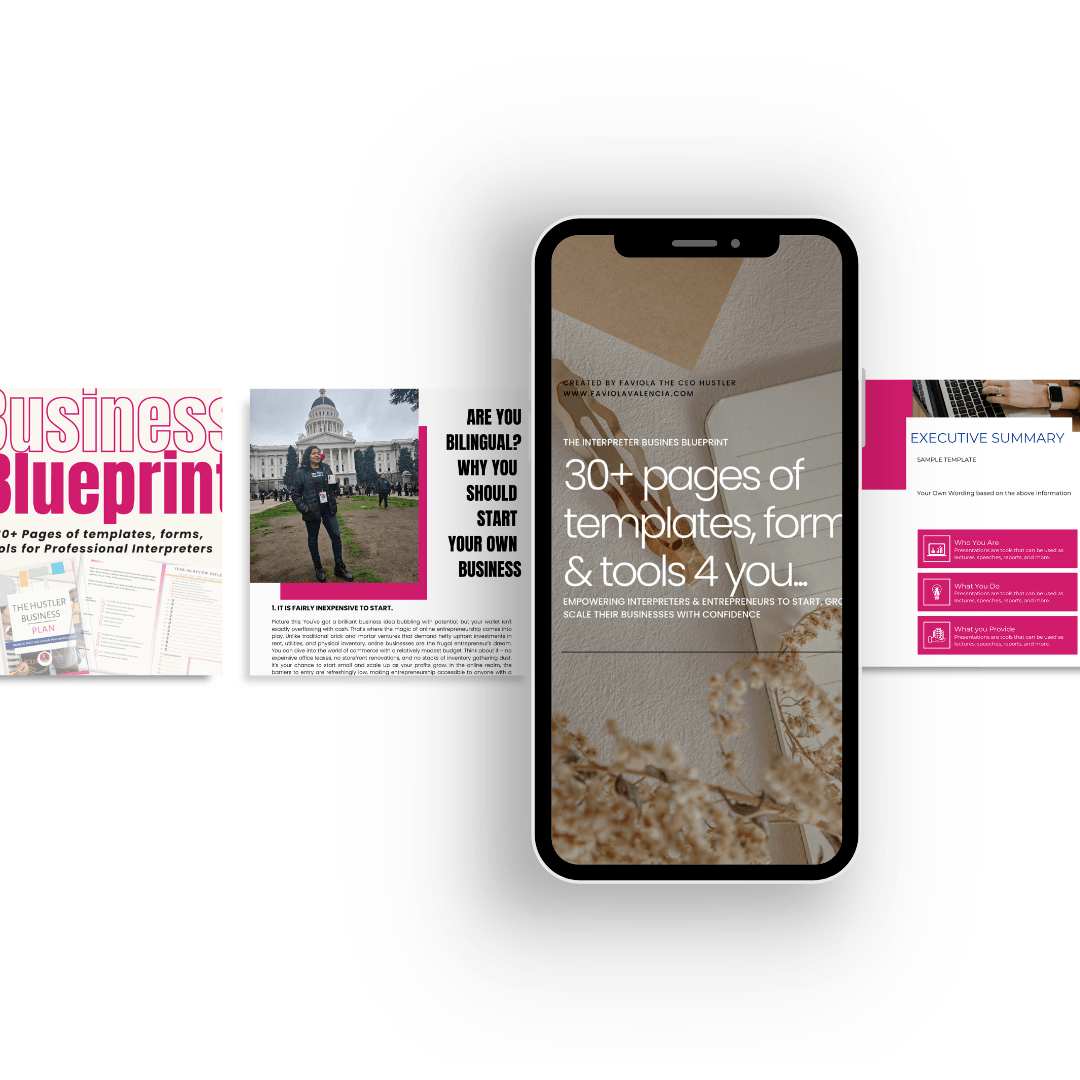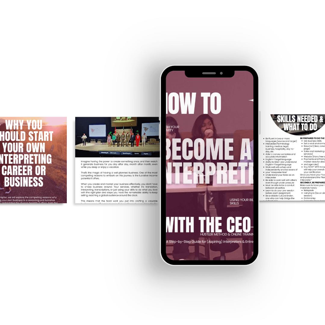 ✅ Business Coaching: Launch, grow & automate your hustle ✅ Interpreter Training: Become a professional & confident Interpreter ✅ Language Services: Spanish interpreting + access to 100+ languages onsite, locally or abroad ✅ Digital Resources: Downloadable guides, workbooks, & mini-trainings