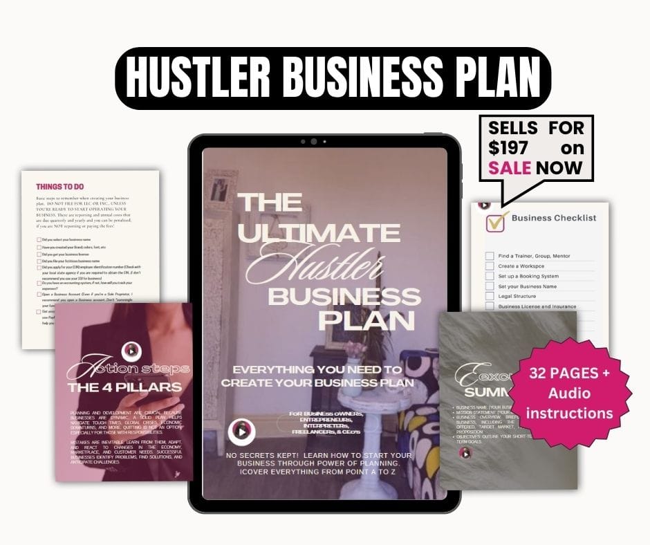 Grab the Hustler Business Plan™ — the step-by-step guide that helped me go from broke to booked and build a 6-figure biz from my bedroom.